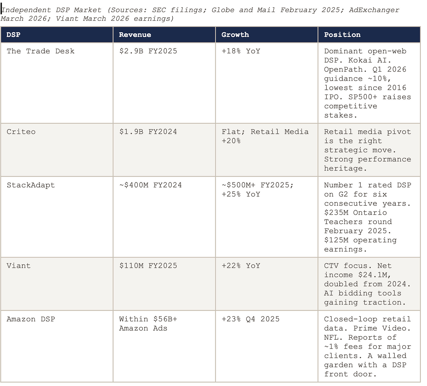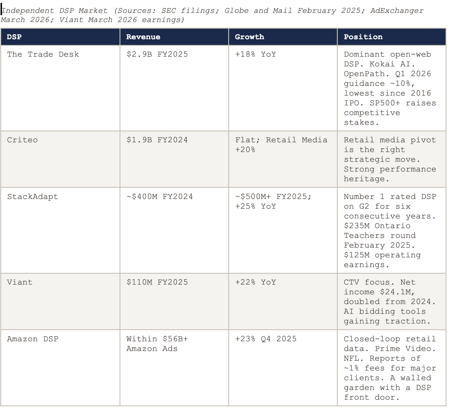 StackAdapt’s numbers are worth examining carefully. The Globe and Mail reported in February 2025 that StackAdapt generated nearly $400 million in revenue in FY2024 and was expected to surpass $500 million in FY2025 with more than $125 million in operating earnings, making it one of Canada’s most profitable private technology companies. Ontario Teachers’ Pension Plan led a $235 million funding round. Six consecutive years rated number one DSP on G2 by user satisfaction. Founded by former WPP employees who built the platform they wished existed when they were agency practitioners. That origin story tends to produce user-focused product development rather than billing-optimised product development, and the customer satisfaction ratings reflect it.