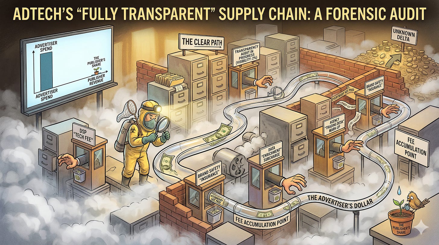 The first article ( The Honest Broker - The Trade Desk, the Agency Cartel, and the $1 Billion Secret Nobody Was Supposed to Find ) attracted considerably more attention than expected, and the conversations that followed were genuinely illuminating. Brand-side practitioners, agency people, publishers, platform executives, all of them said far more specific things in private messages than they were willing to say publicly. Dozens of DMs. A series of Zoom calls with people who wanted to go further. The pattern was consistent: strong, specific opinions shared in private that the same people would not put their name to in public. The clearest recurring theme: pointing at someone else’s opacity does not make your own opacity acceptable. Several people from the brand side described discovering platform fee overcharges through real-time campaign monitoring, not through a formal audit, and being told directly by the platform that this was simply how it worked. That sentence, delivered without apparent embarrassment, is the most concise description of this industry’s culture that anyone offered. And all of it — the DMs, the calls, the private frustrations that cannot be said in public — pushed me toward a question I had not asked clearly enough in the first article. Not “who is doing this?” but “why does the structure make it possible?” Which meant going back to first principles.