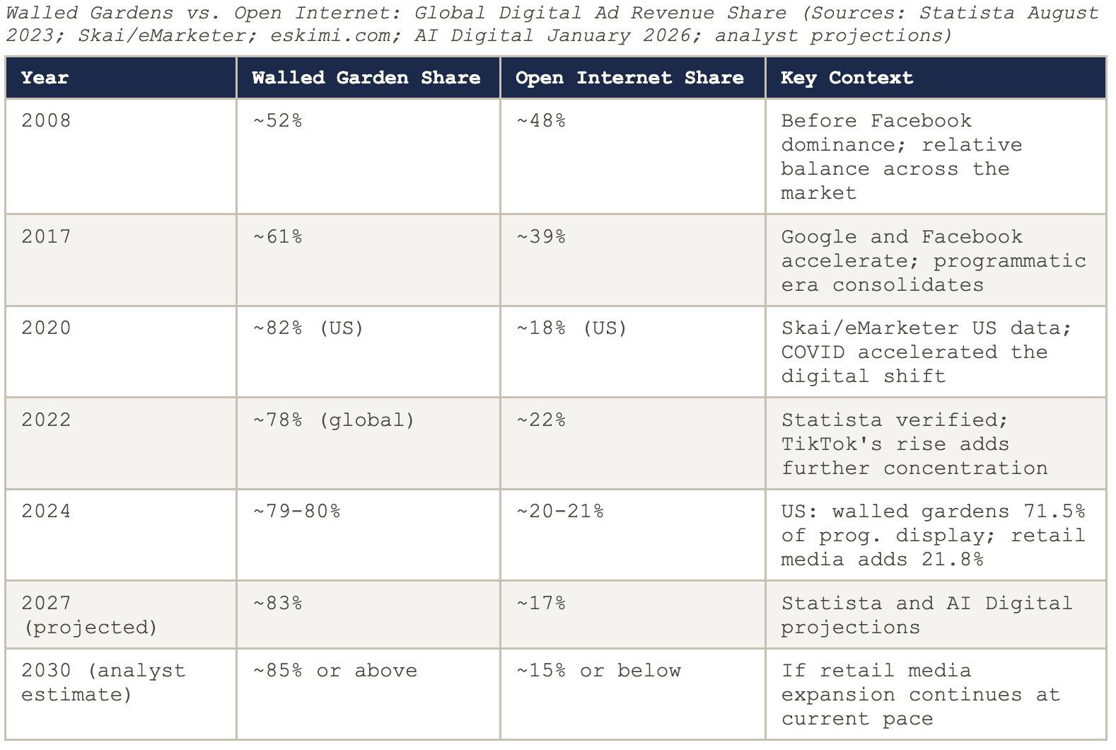 In 2008, walled gardens held approximately 52 percent of US digital advertising revenue. By 2020, per Skai’s analysis of eMarketer data, they held over 82 percent in the United States. Globally, Statista reported that walled gardens reached 78 percent of digital advertising revenue in 2022. The projected share for 2027 is 83 percent. Analyst consensus places the 2030 figure above 85 percent if the retail media expansion continues at its current pace.