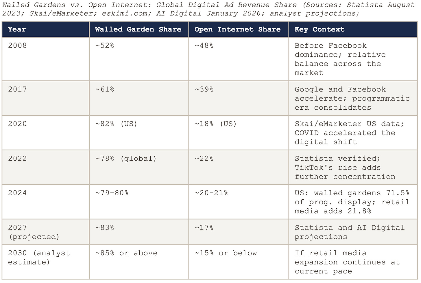 The open internet received more advertising money in absolute dollar terms in 2024 than in 2016. Total global digital ad spend grew to approximately $650 billion in 2024. In absolute terms, the open internet is a larger business than it was. In share terms, it went from approximately 48 percent of global digital advertising in 2008 to approximately 20 to 21 percent in 2024. New walled gardens are being created constantly: TikTok built one of the fastest-growing ad platforms in history from essentially zero after 2019 and now has approximately one billion monthly active users. Retailers, from Walmart to Target to Kroger to Tesco, have turned their customer data into closed advertising ecosystems. The market is expanding and the walled garden share of that expanding market is growing faster than the open internet’s share. In the long race, the open internet is losing ground every year even as the cheque it receives gets slightly larger. Focusing on absolute growth to avoid discussing relative decline is precisely the kind of statistical framing that has allowed the industry to avoid the harder conversation for a decade.
