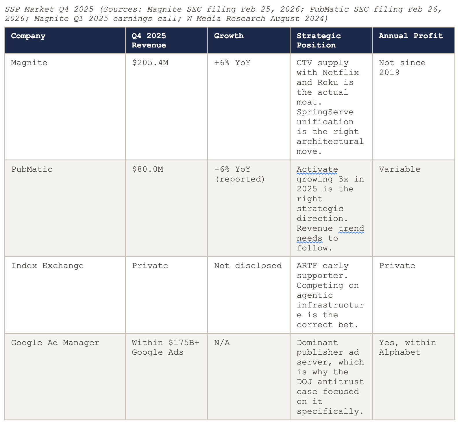 Magnite has not posted an annual net profit since 2019 and invests over $200 million annually in R&D. On the Q1 2025 earnings call, CEO Michael Barrett’s primary growth argument was that the Google antitrust ruling ‘could significantly increase our monetization opportunities and market share, possibly as soon as next year.’ That may be true. It is also a strategy whose timeline is entirely outside Magnite’s control. The SpringServe unification is a more durable bet because it is entirely within Magnite’s control and delivers something publishers demonstrably want: a single system for their entire monetization operation. Building on that is the right path forward.