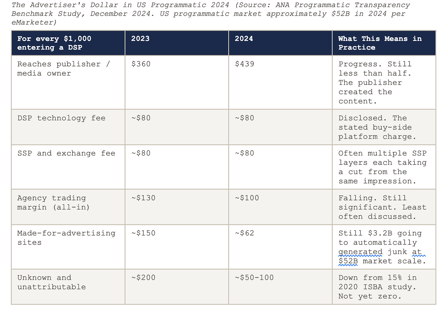 The ANA found in its 2024 benchmark that 6.2 percent of US programmatic spend, roughly $3.2 billion at $52 billion total market size, still landed on made-for-advertising sites, with some marketers directing more than 25 percent of their budgets there. The BBB inventory, dressed as AAA, sold at the AAA price. The publisher who created genuine premium content receives forty-four cents of the advertiser’s dollar. The farmer gets two cents.
