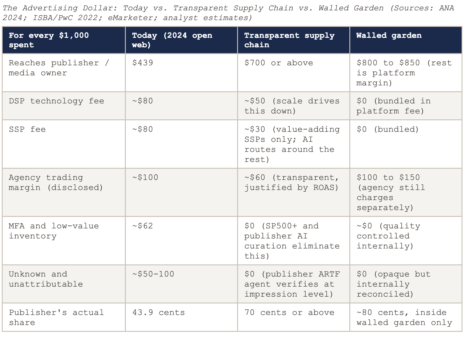 The walled garden delivers 80 cents to the publisher because the publisher IS the walled garden. There is no external supply chain extracting a toll because the platform owns both sides of the transaction. The open internet’s answer to this cannot be another transparency pledge. It has to be 70 cents, delivered verifiably, confirmed by AI agents at the impression level, with ROAS outcomes that an independent firm can audit and compare to walled garden alternatives.
