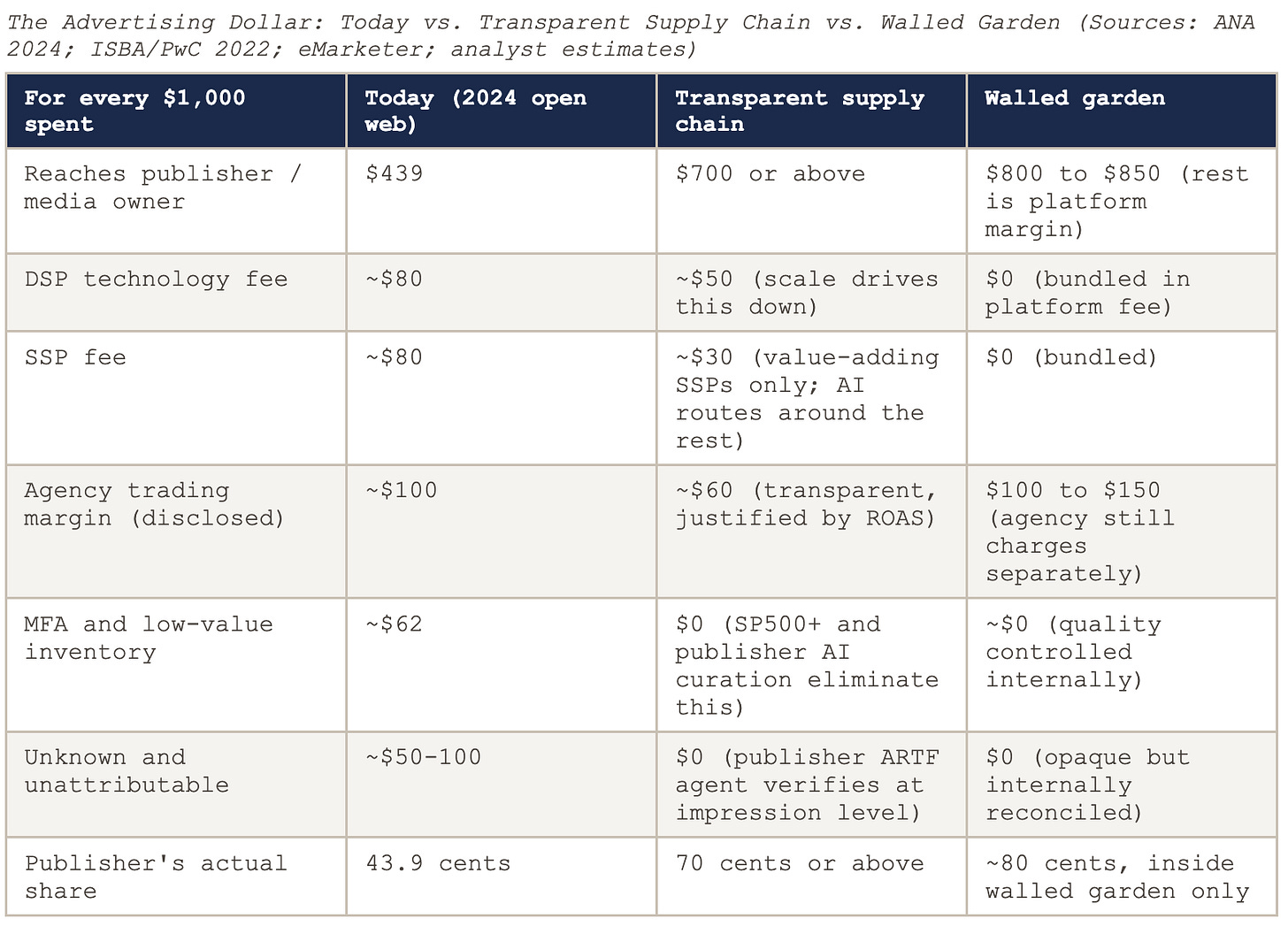 One last thing, and this is the reason this article exists. Every time adtech faces a genuine structural reckoning — privacy sandbox, the DOJ case, the ISBA/PwC findings, the arrival of AI — the industry’s first instinct is to reach for the vocabulary of the existing architecture. New technical standard? Build a working group. New privacy requirement? Launch a coalition. New technology? Retrofit it onto the current stack and give it a new acronym. That instinct is understandable. It is also the instinct that has kept the farmer at two cents and the pension fund manager holding AAA-rated BBB paper. The only way out is to stop, get off the bandwagon for a moment, and ask the genuinely simple questions. What is this industry, at its most basic level? Supply and demand. Publishers and advertisers. Anything in the middle needs to justify its existence by making that exchange more efficient and more valuable — not by making it more opaque. If your business model requires the publisher not to know what their inventory is worth, and the advertiser not to know where their money went, you are not adding value. You are making hay while the sun shines. And the sun, as this article has attempted to document in considerable empirical detail, is beginning to set on that particular field.