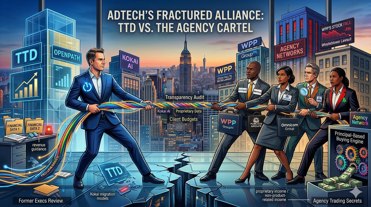The agencies that built their business models on the practices the K2 report documented in 2016 — the practices that led to law enforcement raids in China in 2023, to a $100 million whistleblower lawsuit in 2025, to internal documents describing a financial model whose primary beneficiaries, according to those documents, were not the clients paying for it — these agencies did not suddenly discover transparency concerns in 2026. They discovered that TTD’s growth was making their opacity structurally harder to maintain. And they reached for the language of transparency to address it, from a position whose relationship with that concept is, as the factual record demonstrates, complicated.