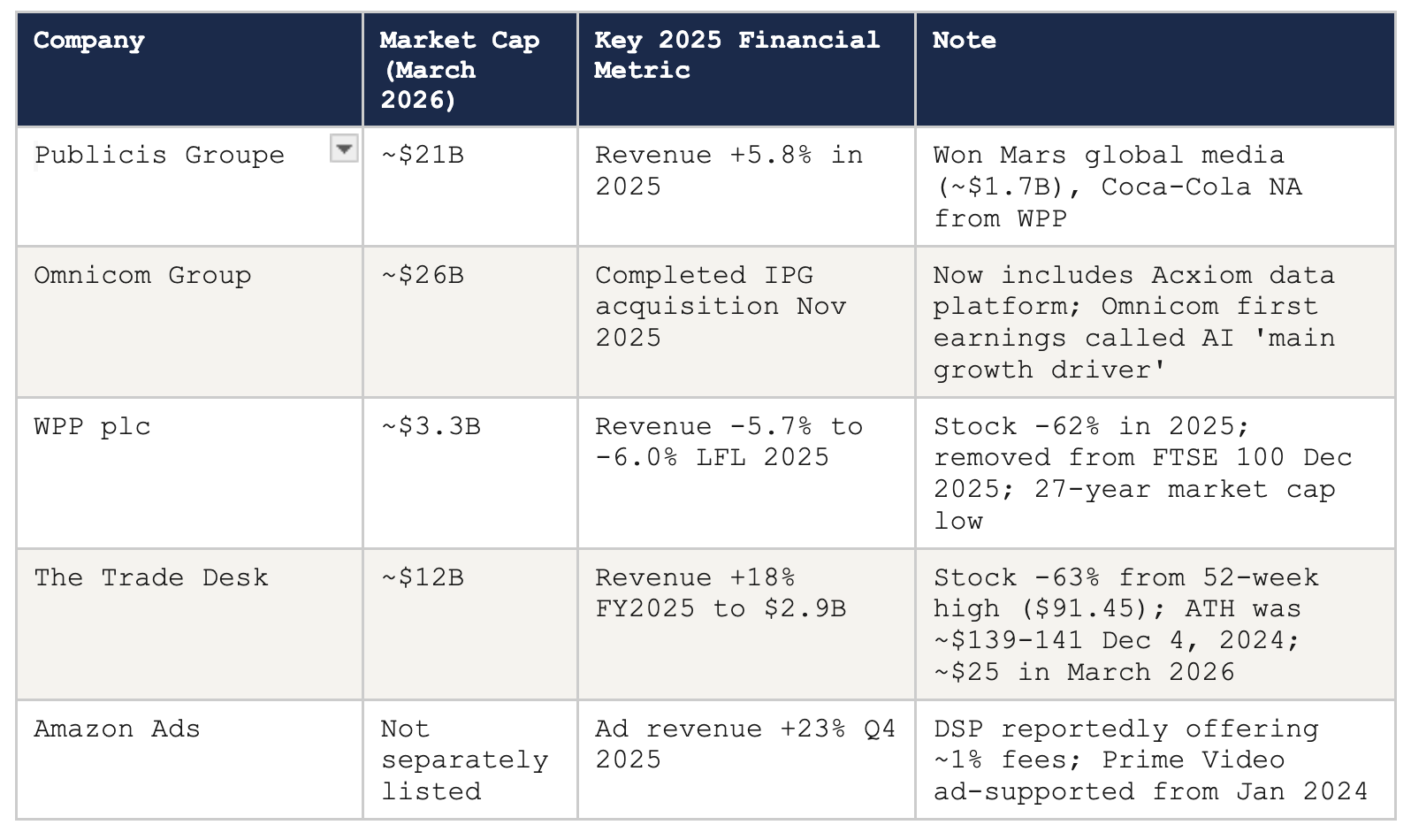 WPP’s market capitalisation of approximately $3.3 billion as of mid-March 2026 is smaller than the value of the accounts it lost to Publicis alone in 2025. The Mars global media account — approximately $1.7 billion — went to Publicis. The Coca-Cola North America media business — approximately $700 million — also went to Publicis. Its top 25 clients fell 4.1% like-for-like in 2025. WPP Media, its trading arm, declined 5.9% for the full year and 10.8% in Q4 alone. The company was removed from the FTSE 100 in December 2025. New CEO Cindy Rose acknowledged publicly that WPP Media had ‘lost its way.’
