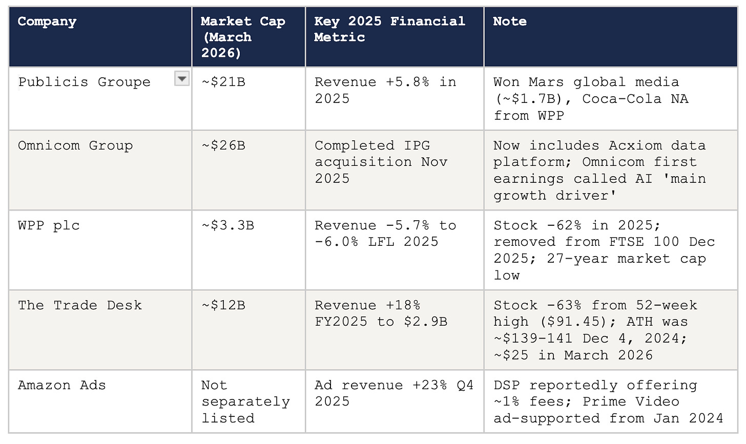 In November 2025, Omnicom completed the acquisition of IPG — transforming the ‘Big Six’ holding companies into effectively a ‘Big Two or Three.’ The new Omnicom includes IPG’s Acxiom data platform, creating first-party data infrastructure competitive with platform data from Google and Meta. Publicis has Marcel AI and Epsilon. WPP has WPP Open. All of them are racing to demonstrate that their AI investments justify the fees they charge. The Trade Desk is watching from a position of financial strength but competitive vulnerability in this race.