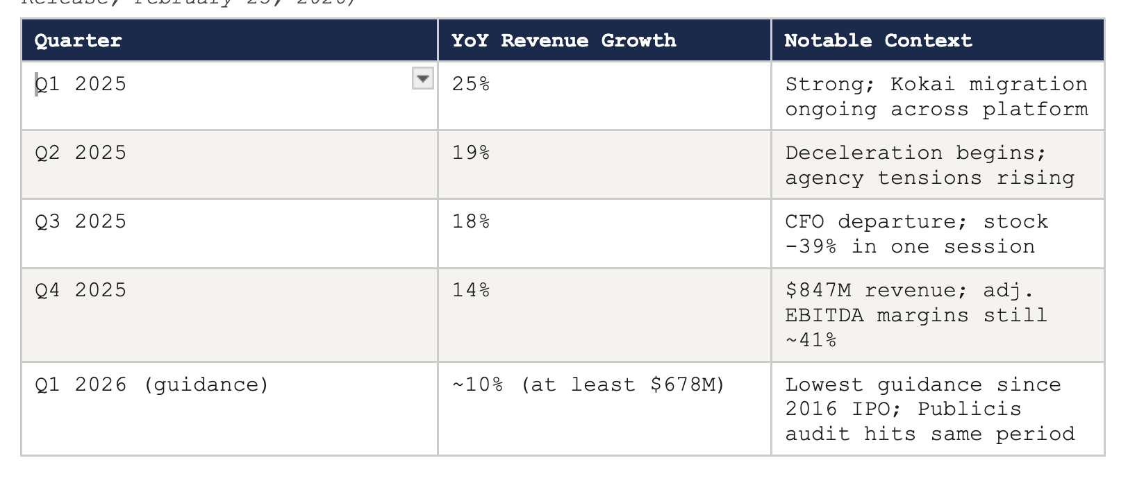 Two CFOs in twelve months was a self-inflicted governance failure. The Kokai rollout execution was a genuine operational lapse for which Green publicly apologised. The account team instability reported by Digiday is correctable. These are real issues in a company that holds itself to a higher standard. Holding itself to that standard means addressing them.