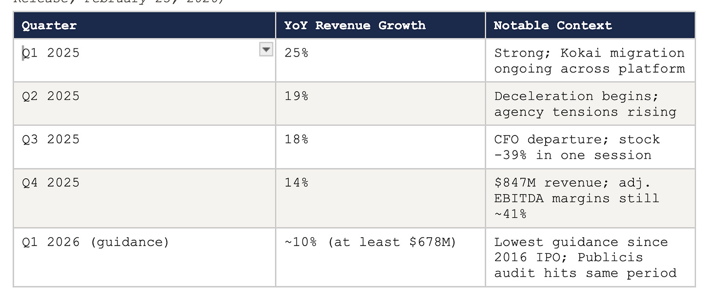 The deceleration is real and material. Amazon Ads reported 23% year-on-year growth in Q4 2025 — compared to TTD’s 14% — and was reportedly offering DSP fees as low as 1% to major spending clients in direct competition. The broader programmatic market grew; TTD’s relative position weakened. These are real competitive dynamics, not simply the result of agency pressure.
